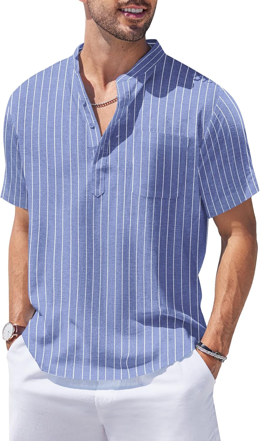 Crafted from a comfy cotton blend, The Ios garment captures the essence of European-style with its textured stripe aesthetic.